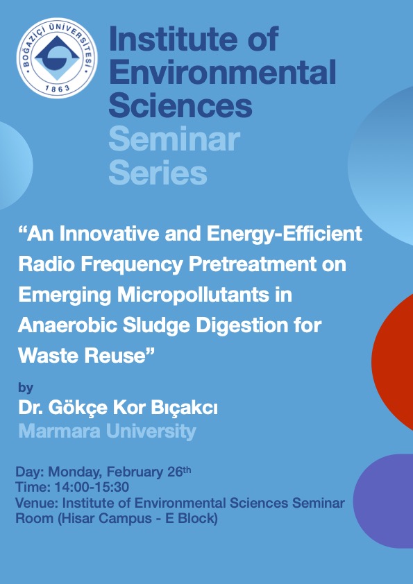 We cordially invite you to our seminar “An Innovative and Energy-Efficient Radio Frequency Pretreatment on Emerging Micropollutants in Anaerobic Sludge Digestion for Waste Reuse”, by Dr Gökçe Kor Bıçakcı, Marmara University, Department of Environmental Engineering.