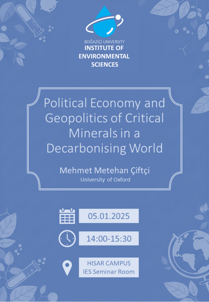 We cordially invite you to our seminar “Political Economy and Geopolitics of Critical Minerals in a Decarbonising World” to be held by Dr. Mehmet Metehan Çiftçi, University of Oxford