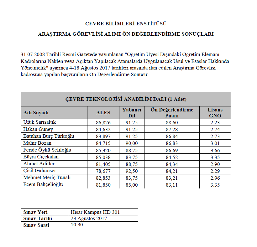 ÇBE Araştırma Görevlisi Ön Değerlendirme Sonuçları için lütfen