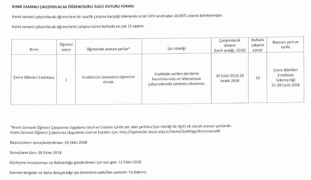 Kısmi zamanlı çalıştırılacak öğrencilerle ilgili duyuru formuna